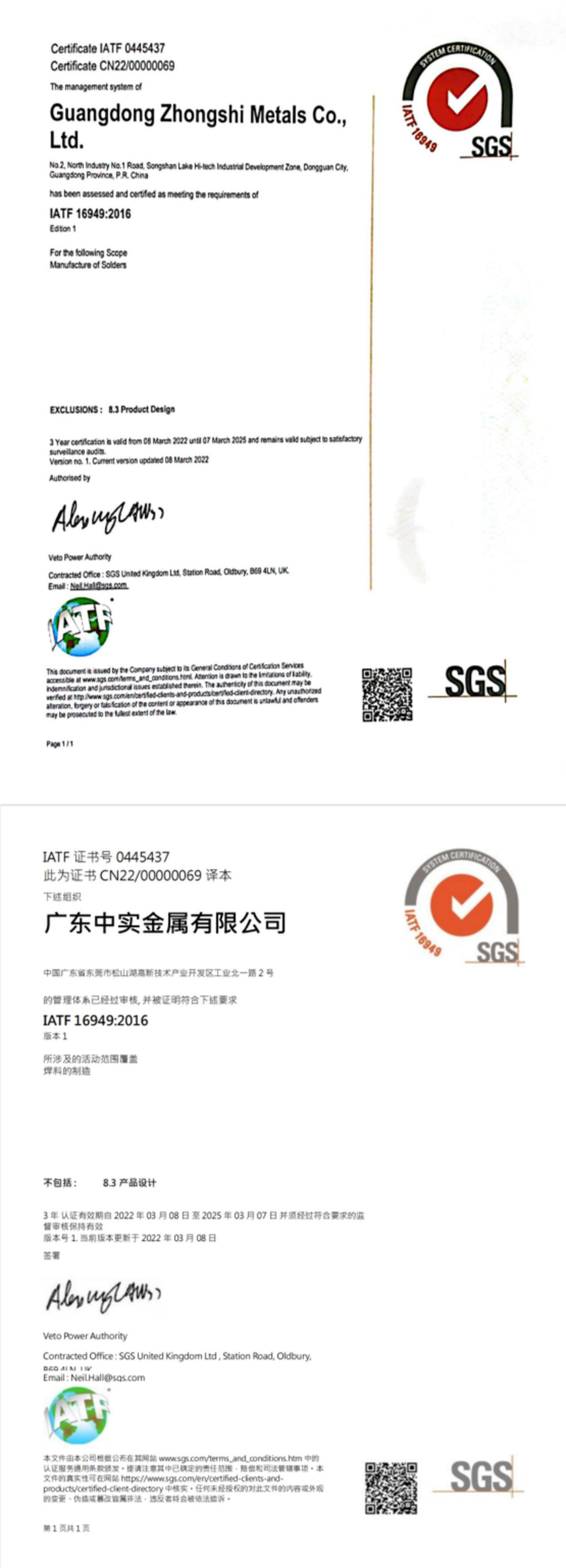 作為深耕高端焊料20多年的行業(yè)頭部企業(yè),中實公司一直遵循嚴(yán)格的管理體系與方法進(jìn)行產(chǎn)品研發(fā)和生產(chǎn),公司先后通過了ISO9001質(zhì)量管理體系認(rèn)證、ISO14001環(huán)境管理體系認(rèn)證、QC080000危害物質(zhì)過程管理體系認(rèn)證等。
